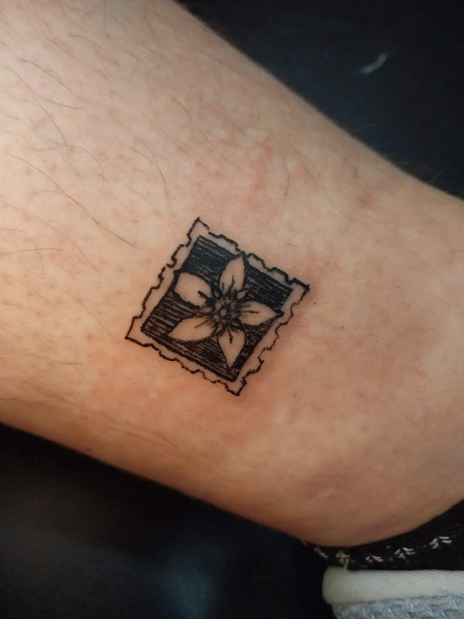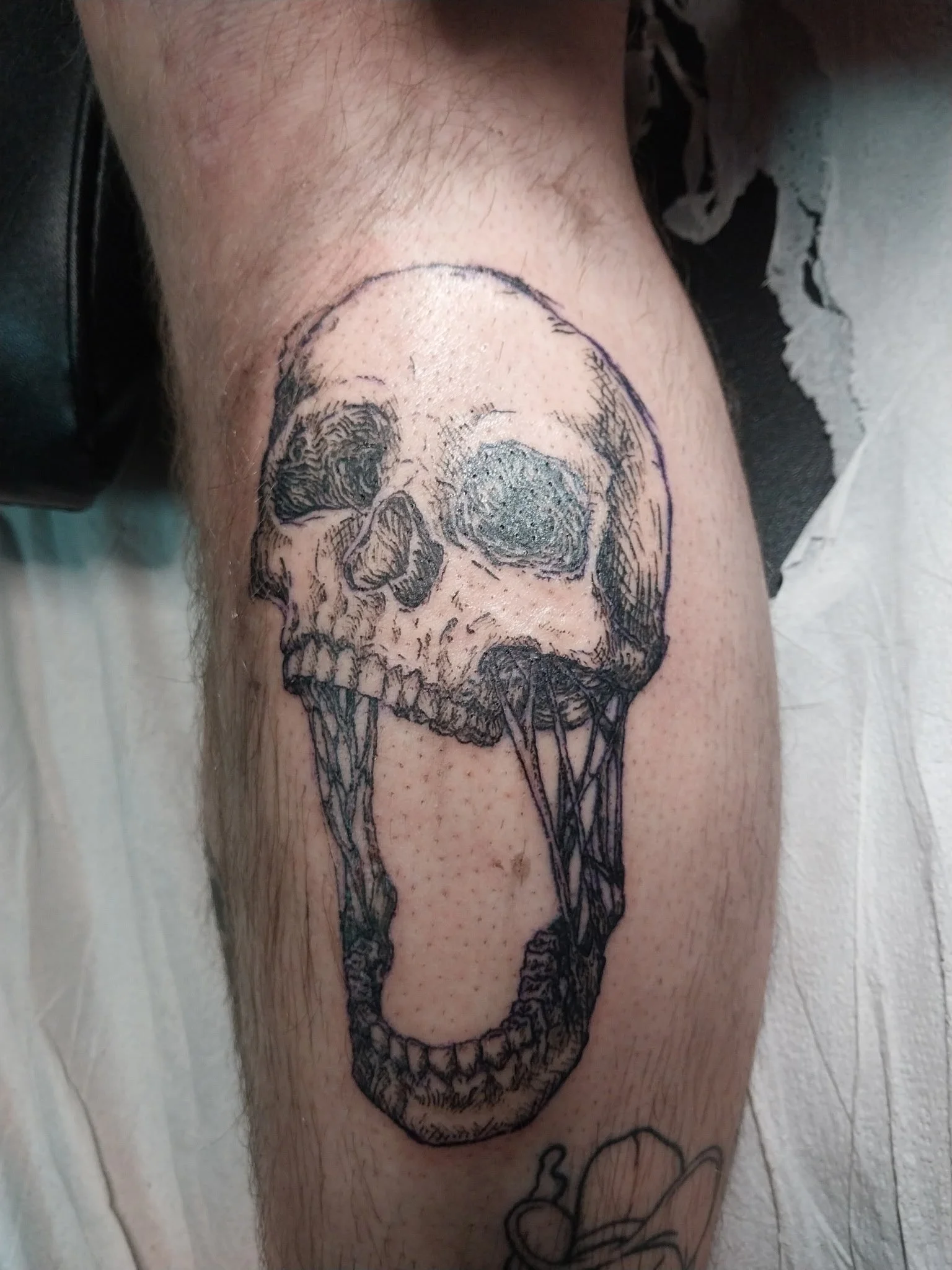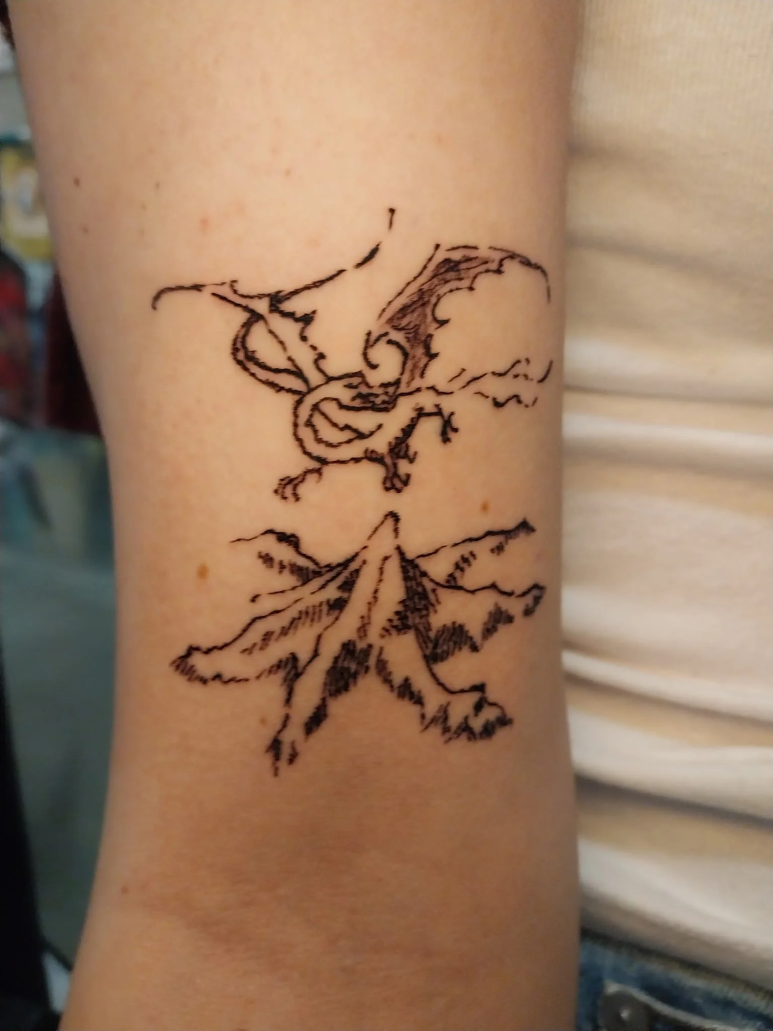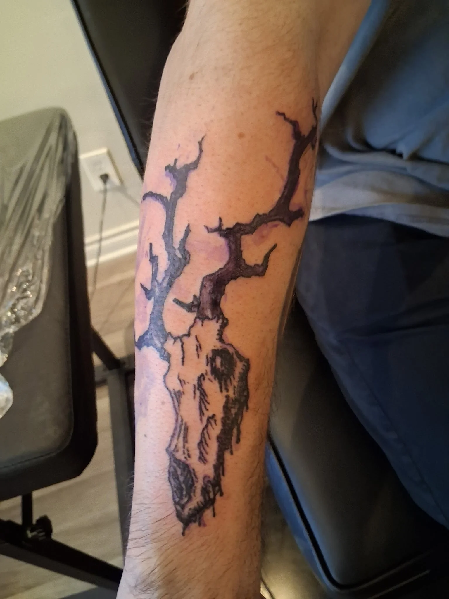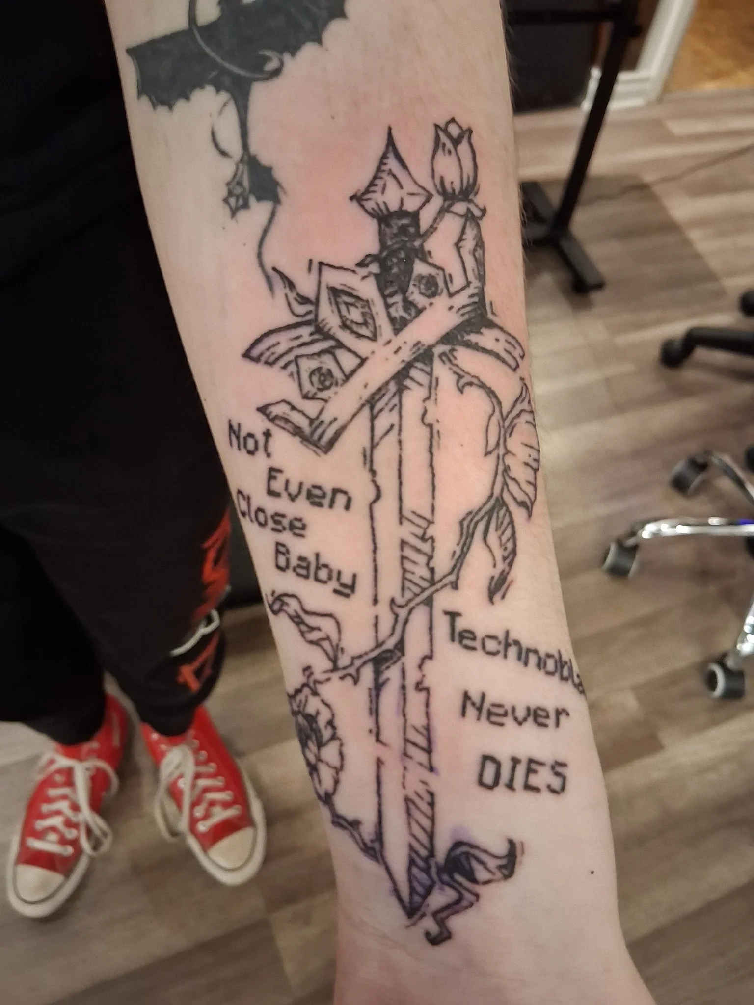 Their style brings the creativity of a sketchbook to life on skin, utilizing scratchy and bold lines. Growing up playing dnd and video games offered an escape from the stress and grief of real life. Many of the characters and narratives brought them comfort, and being able to offer a symbol of that comfort is fulfilling. They’ve always been fascinated by mysteries and creepy stories, and love to capture cryptids in their designs, drawing from old folktales and stories they grew up reading. Along with telling scary stories, Caff frequently seeks out remote places in the outdoors to feel free and spends time studying nature to emulate botanical forms in their style. The punk movement is a social movement they are passionate about; representing punk imagery and symbolism is one of the ways they feel they can support the cause.